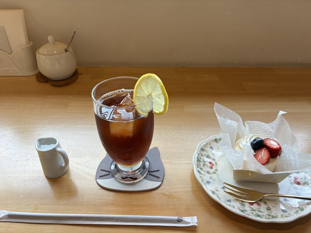 ショーケースからケーキを選び、レジでドリンクを注文し、カフェスペースでいただくスタイルです。