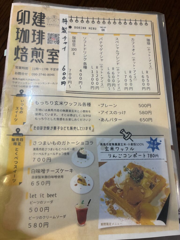 うだつの建物の中でコーヒーとワッフルを楽しむ体験は、この場所ならではの贅沢です。
