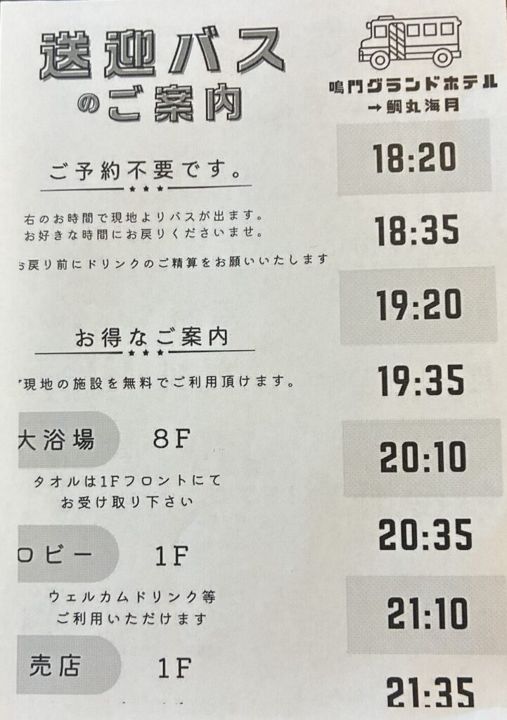 夕食会場から元の鳴門海月別邸シーサイドホテル鯛丸海月に戻る場合にも送迎バスが出ています。