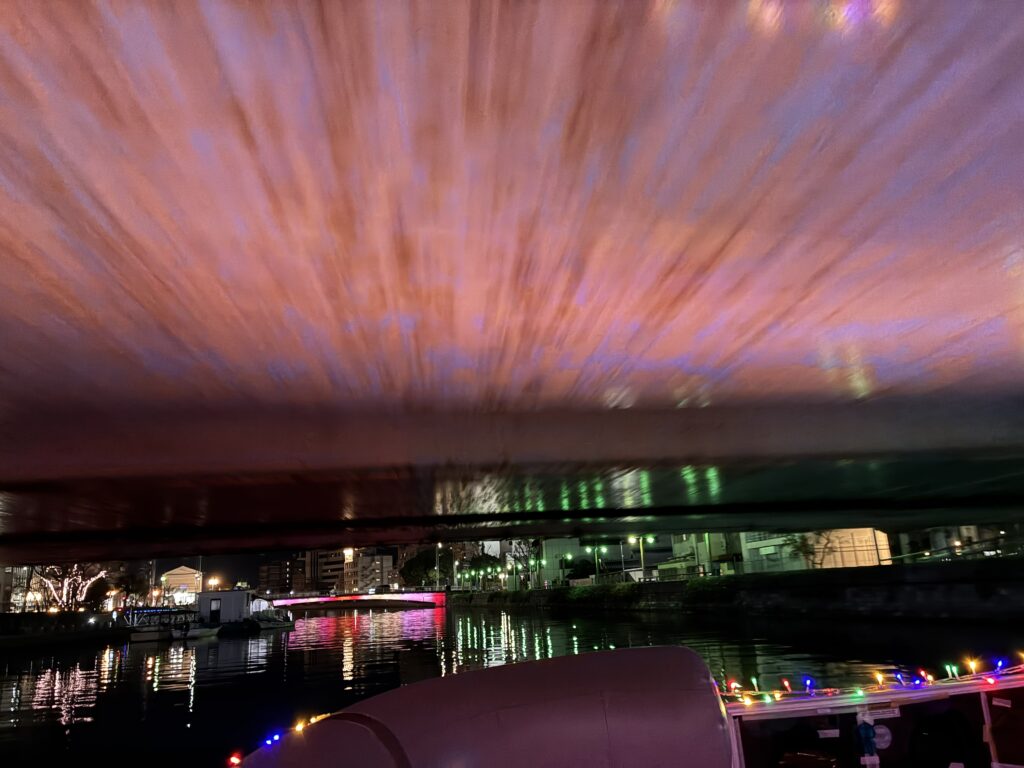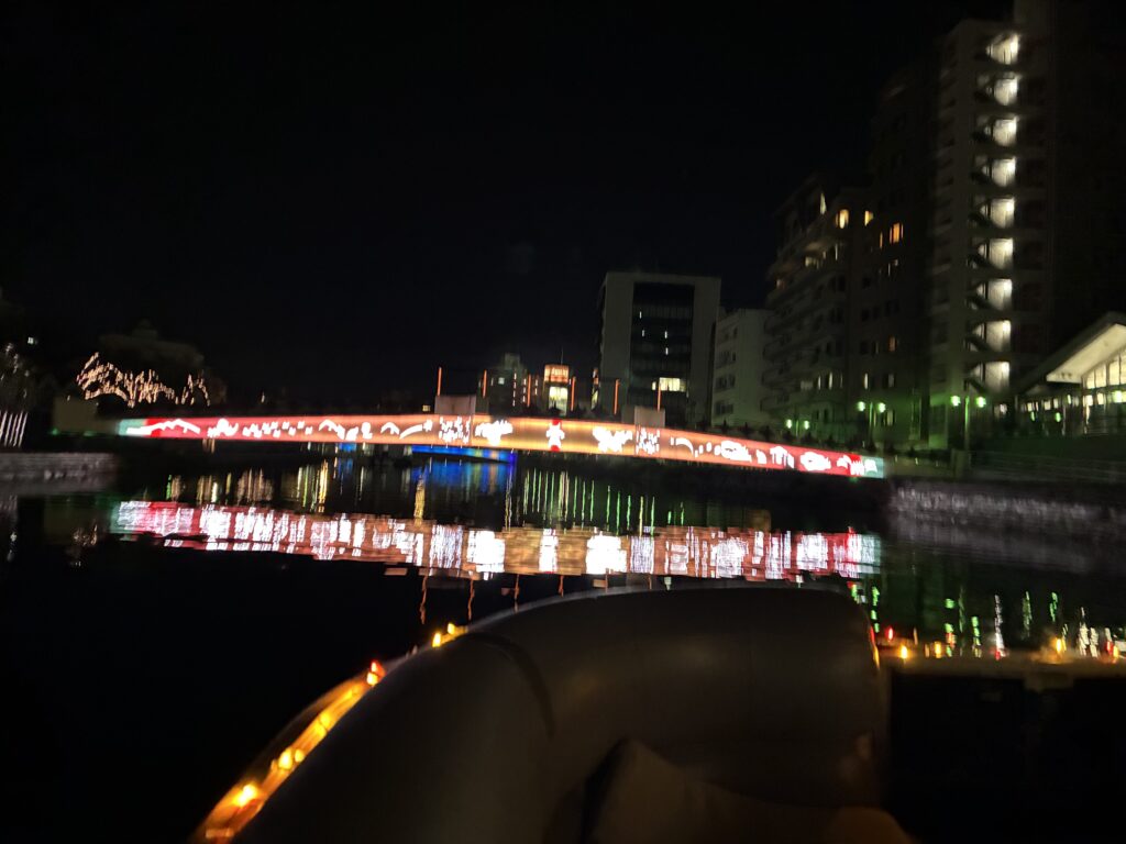 夜のひょうたん島クルーズでは、冬の澄んだ空気の中でイルミネーションに彩られた橋を間近に体感。